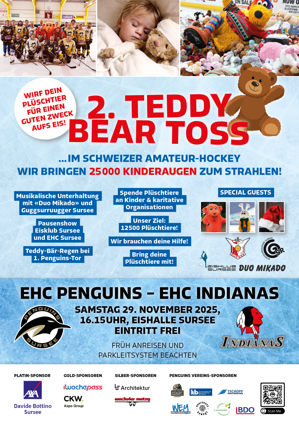 Kommt am 29.11.2025 in die Eishalle Sursee, bringt Eure alten Plüschtiere mit - gemeinsam bringen wir 25’000 Kinderaugen zum Strahlen!